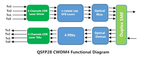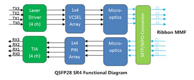 Он предлагает четыре канала для передачи и четыре канала для приема, каждый из которых способен работать со скоростью 25Gb/s для совокупной скорости передачи данных 100Gbps на расстояние 100м по многомодовому волокну, что аналогично CFP LR4. Однако QSFP28 SR4 не мультиплексирует оптические сигналы в WDM для передачи. Его функциональная схема показана показана ниже.