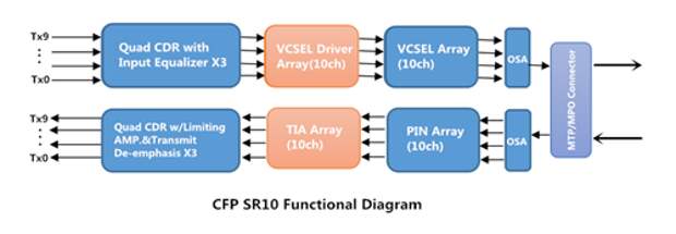 Понимание этого функционального режима может помочь вам выбрать подходящую 100G оптику для вашей сети.CFP SR10 - это 100Gbps параллельный модуль для приложений оптической связи. Он поддерживает передачу на расстояние 100 м и 150 м через кабель OM3 и OM4 с лазерной оптимизацией. Этот трансивер преобразует 10-канальные 10Gbps электрические входные данные в 10-канальные 850нм оптические сигналы, и потом соединяет их со схемой ленточного волокна (MPO разъем) для передачи 100Gbps оптического сигнала. На стороне приемника оптические сигналы преобразуются в электрические данные для 10 выходных каналов. Ниже показана функциональная диаграмма.