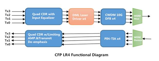 CFP LR4 является другим членом 100G модулей CFP. Но его рабочий процесс немного отличается от модуля CFP SR10. CFP LR4 использует четыре канала для передачи и четыре канала для приема. Он использует четыре WDM оптических сигнала и мультиплексирует их в один канал для передачи 100G. На стороне приемника он демультиплексирует 100Gbps сигналы в четыре WDM оптических сигнала и потом преобразует их в четыре выходных канала. Его функциональная схема показана ниже.