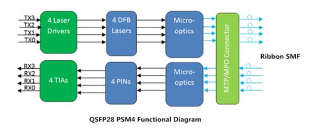 Функциональный режим QSFP28 PSM4 очень похож на режим QSFP28 SR4. Он использует четыре независимых канала передачи и приема. Каждый канал работает со скоростью 25Gbps. Разница в основном заключается в волокне, который они используют. QSFP28 PSM4 работает с одномодовыми ленточными оптическими пачт-кордами, а QSFP28 SR4 работает с многомодовыми ленточными оптическими пачт-кордами.